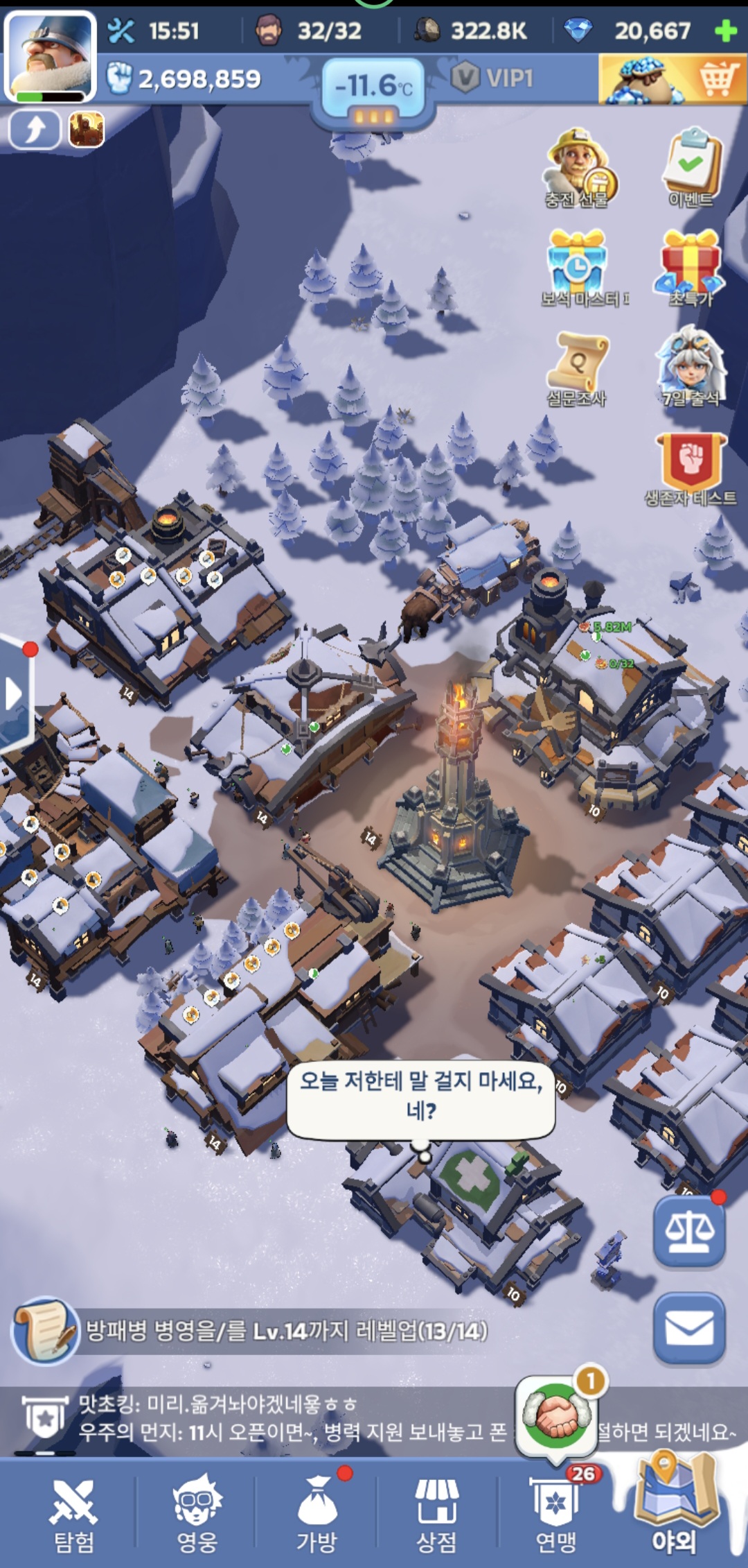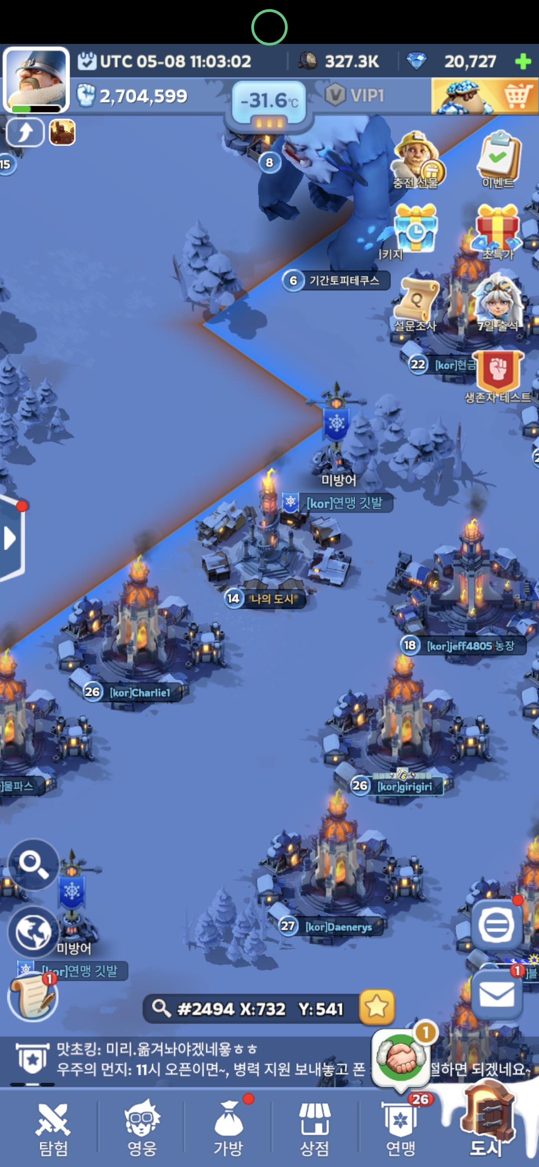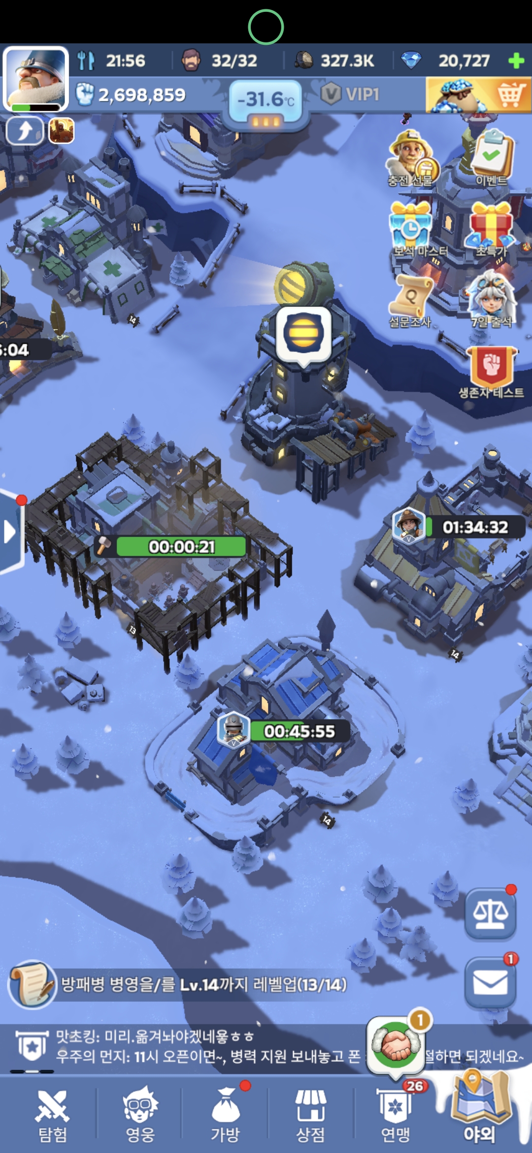 게임의 매력을 더하는 핵심 요소 중 하나는 바로 주기적으로 발생하는 다양한 이벤트와 콘텐츠입니다. 특히 눈보라 이벤트는 준비 부족 시 주민 대량 사망까지 초래할 수 있어 극도의 긴장감을 유지하게 만듭니다. PvE 콘텐츠로는 곰사냥 작전, 자원 탐사, 몬스터 격퇴 등이 있고, 후반부에는 PvP 콘텐츠로 유저 간 전쟁과 자원 쟁탈이 활발해집니다.