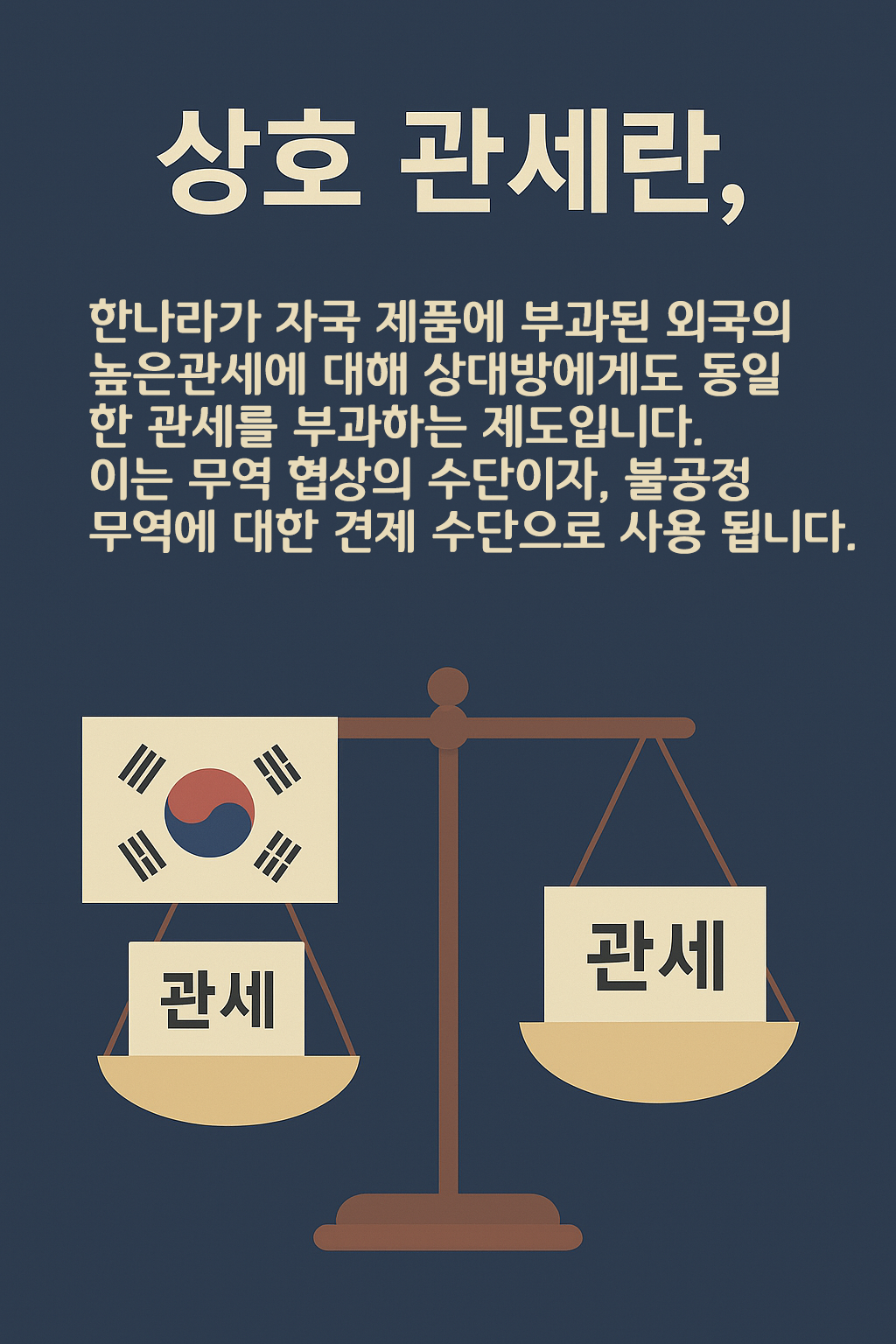 상호 관세(Reciprocal Tariff)는, 한 나라가 자국 제품에 부과된 외국의 높은 관세에 대응해, 상대국 상품에 동일하거나 유사한 관세를 부과하는 제도입니다.